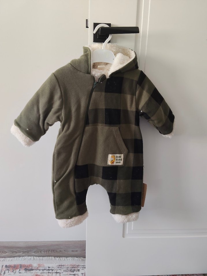 Yeşil kareli desenli, kapüşonlu ve sıcak astarlı bebek tulumu. 6-9 ay