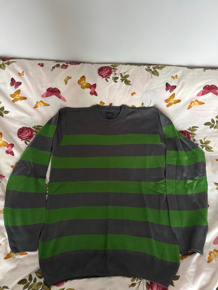Yeşil Gri Çizgili Triko Kazak