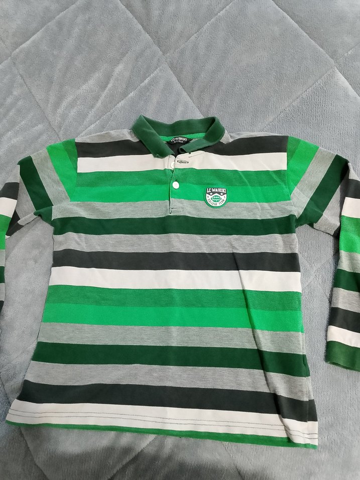 Yeşil Gri Çizgili Uzun Kollu çocuk Polo Tişört
