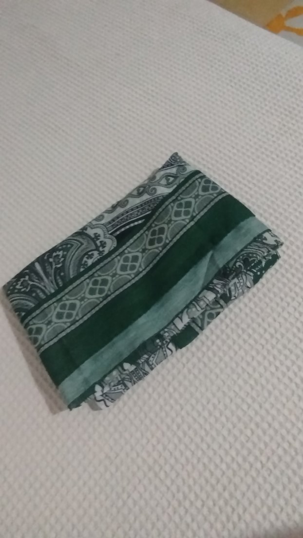 Yeşil ve gri desenli, dökümlü tasarıma sahip kadın şalı, sentetik kumaştan, bohem tarzını yansıtıyor.