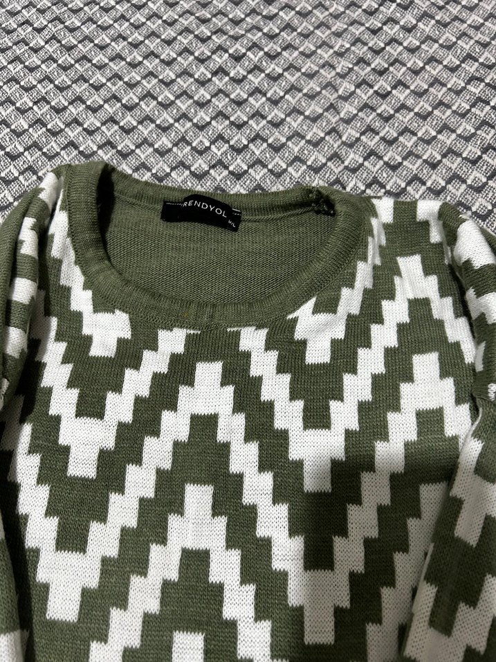 Yuvarlak yaka ve uzun kollu, gevşek kesim kadın triko kazak. Yeşil ve gri renklerde geometrik desenlidir, rahat ve şık bir görünüm sunar.