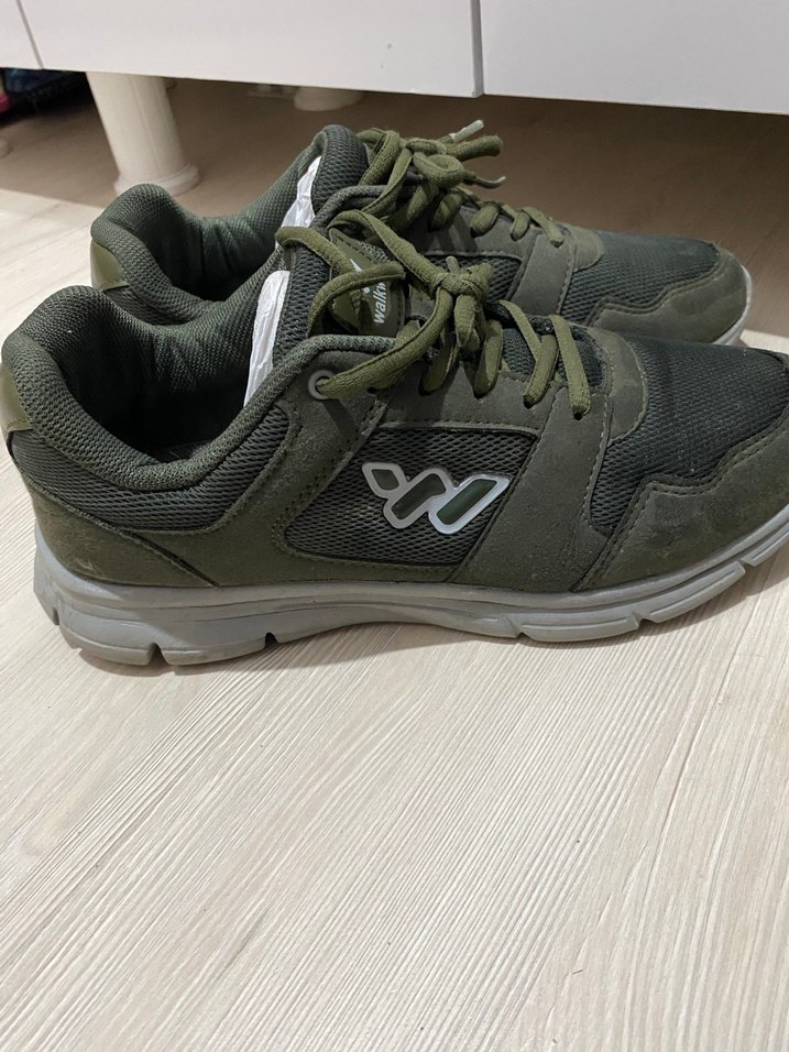 Yeşil ve gri renklerde, kauçuk tabanlı, cırt cırtlı erkek spor ayakkabısı. Düz ve desen içermeyen sade tasarım, spor ve günlük sokak stili için uygun.