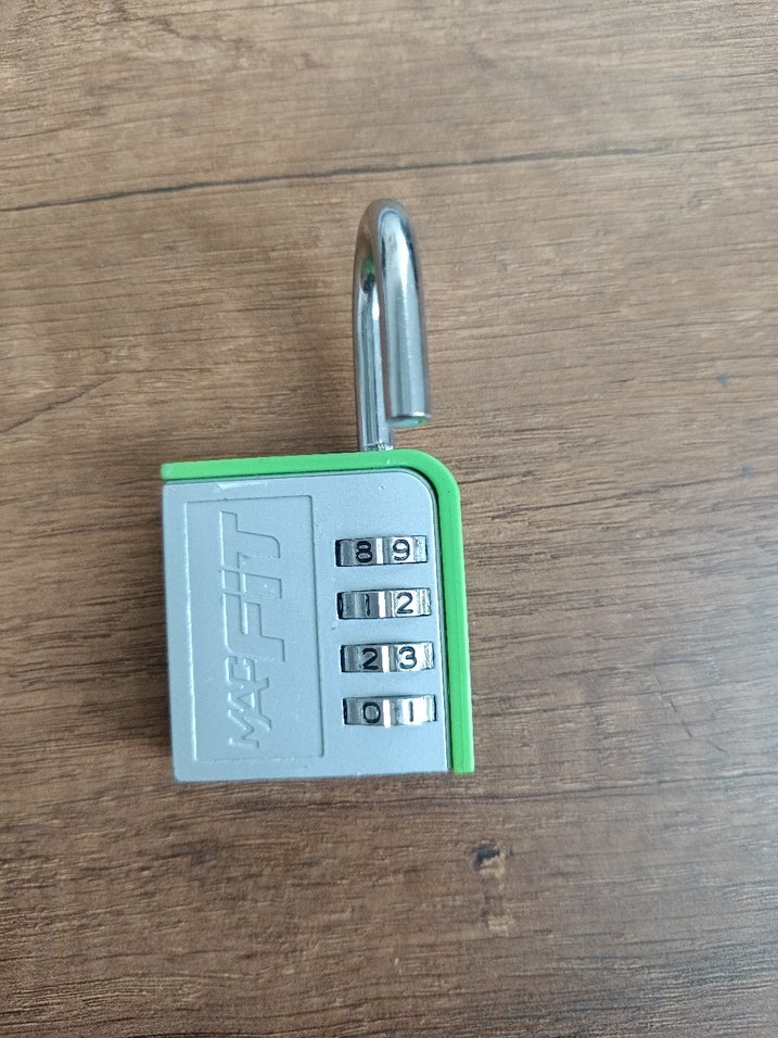 Gri ve yeşil renklerde, dört haneli şifre kilidi bulunan minimalist anahtarlık. Asma kilit