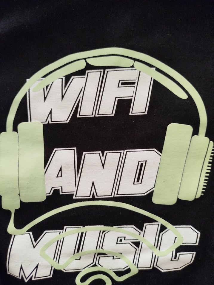 Siyah sweatshirt üzerinde yeşil ve kulaklık deseni ve 'WIFI AND MUSIC' yazısı yer alır. yaşı yazmıyor etiketi kesmişim 7-8-9 yaş uygun