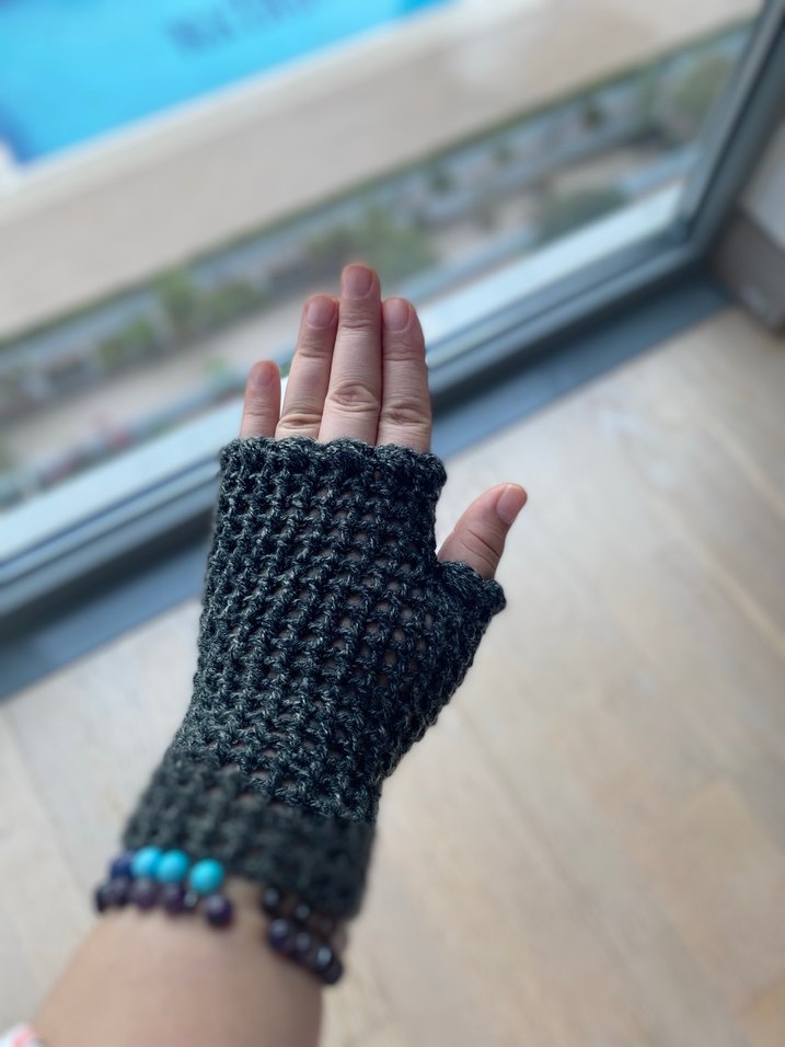 Yeşil, Gri renkli, örgü parmakları açık kadın eldivenleri, rahat ve asi bir tarz sunar.
