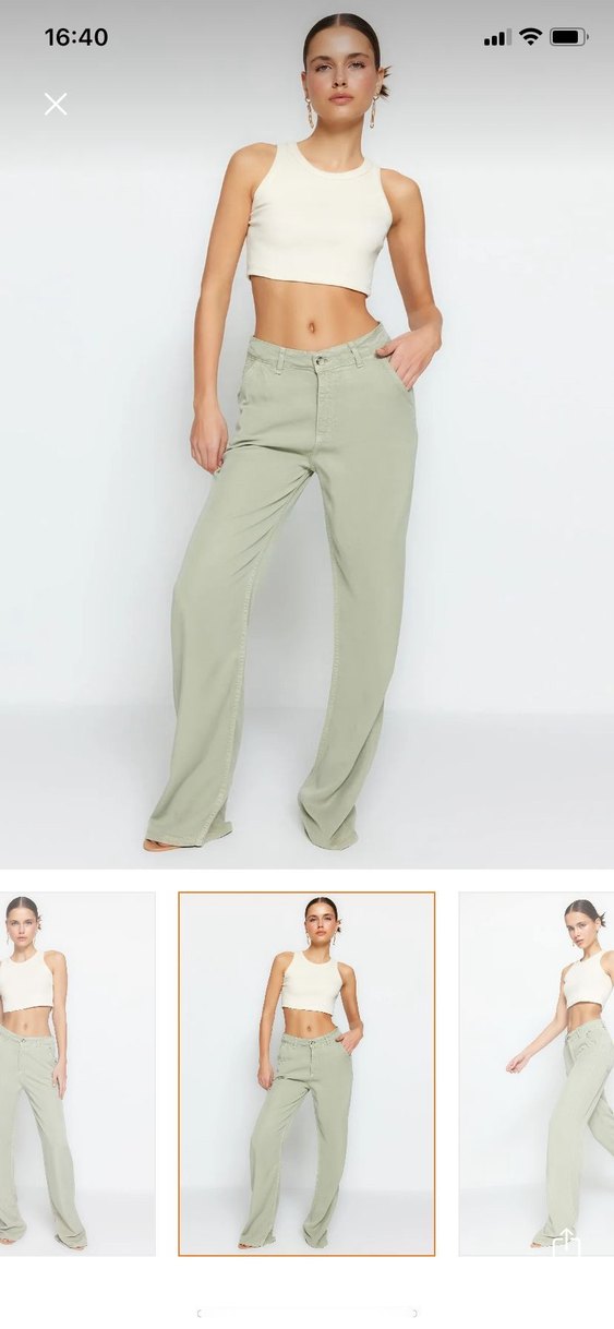 Haki açık yeşil renkli, pamuk kumaştan, bol kesim kadın pantolon. 1 kez giydim sadece bidaha giyilmedi defo vs hiçbir sorunu yok ihtiyaç fazlası trendyolda 780 tl