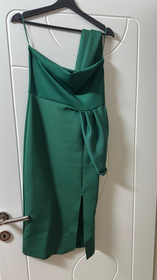 Koyu yeşil, straplez yakalı, kemer detaylı ve vücuda oturan kişi boy abiye elbise. Kolsuz ve etek kısmında yırtmaç bulunur. Üst kısmı bol geldiği için ufak bir tadilat yaptırmıştım.