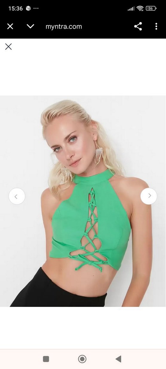 Halter yaka ve bağcıklı ön detaylı, yeşil ve dar kesim crop top. Sentetik kumaştan üretilmiş, parti ve sokak stili için uygun.