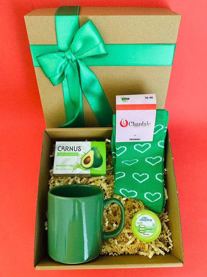 Renkli yeşil hediye kutusunda seramik kupa, kalp desenli çorap, avokado sabunu ve küçük bakım ürünü bulunur.