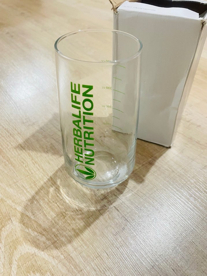 Yeşil Herbalife Nutrition yazılı, üzerinde ölçü işaretleri bulunan cam ölçülü Bardak . Sade ve şeffaf tasarıma sahiptir.