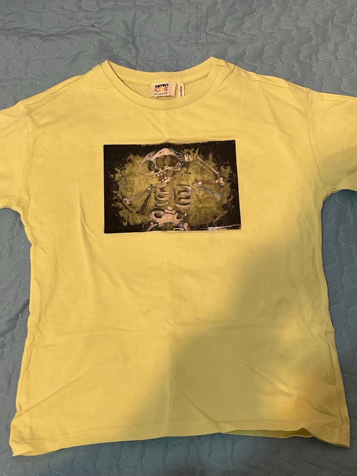 Yeşil, kısa kollu, yuvarlak yakalı erkek çocuk tişörtü. Baskılı, bol kesim ve yumuşak tekstil malzemeden yapılmıştır. Rock punk havası verir.