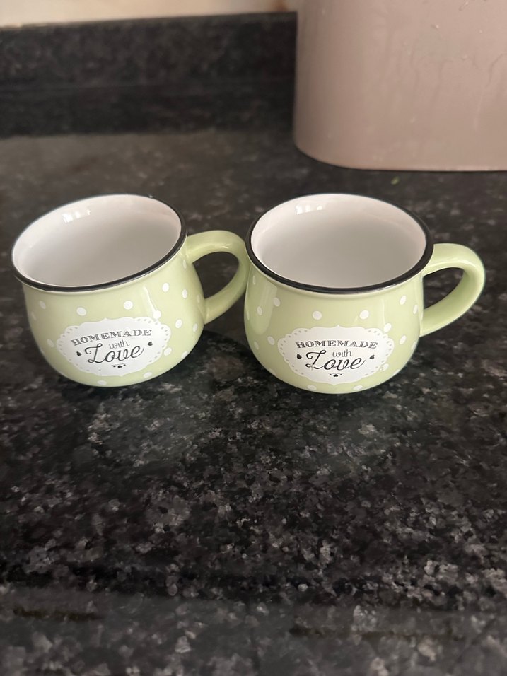 Yeşil renkte, üzerinde "Homemade with Love" yazısı bulunan iki küçük porselen fincan seti. İç kısmı beyaz ve kenarında ince siyah çizgi bulunur. ☕