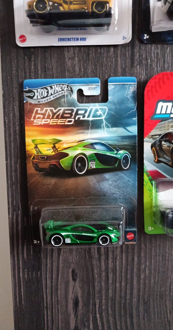 Koyu yeşil renkli Hot Wheels oyuncak araba, üzerinde 'HYBRID' yazısı ve beyaz kenarlı tekerlekleri ile dikkat çekiyor.