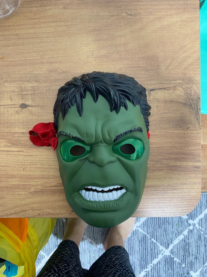 Canlı renklerde yeşil Hulk maskesi, detaylı yüz ifadeleri ve ayarlanabilir bant ile rol yapma ve kostüm için uygundur.