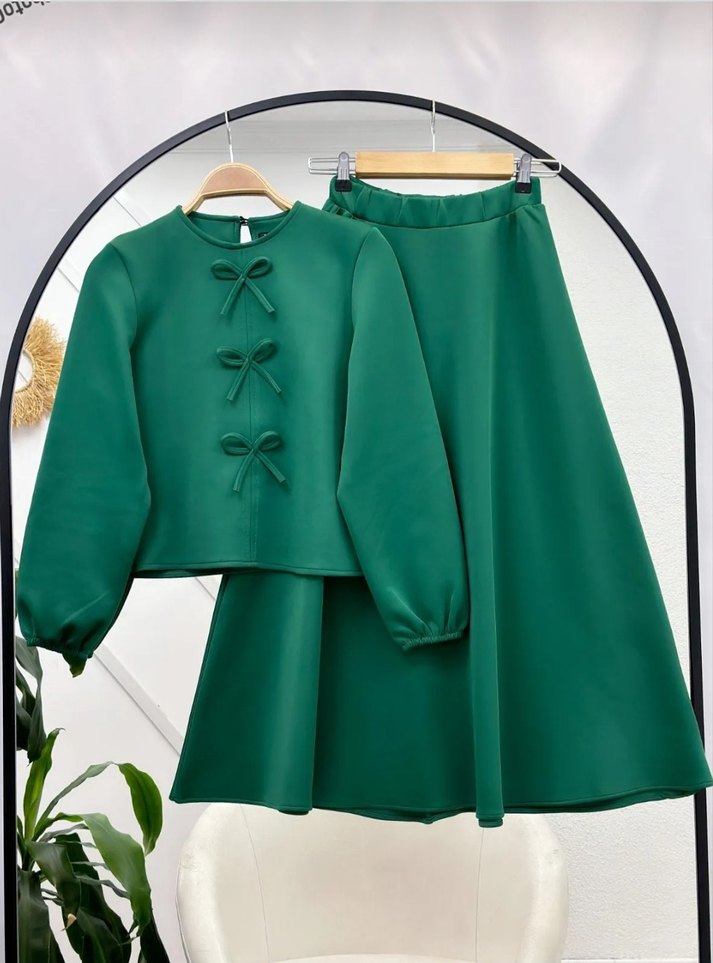 Diger'in yeşil, parlak sentetik kumaştan, nakışlı fiyonk detaylı uzun kollu üst ve uyumlu etek takımı,