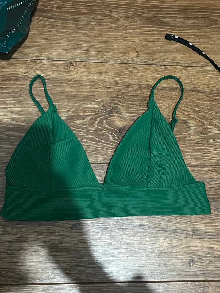 Yeşil renkli, ince askılı ve bohem tarzda, sade ve deseniz bu bikini üstü, plajda cesur ve şık bir görünüm sunar. Normal boyda ve vücuda oturan kesime sahiptir.