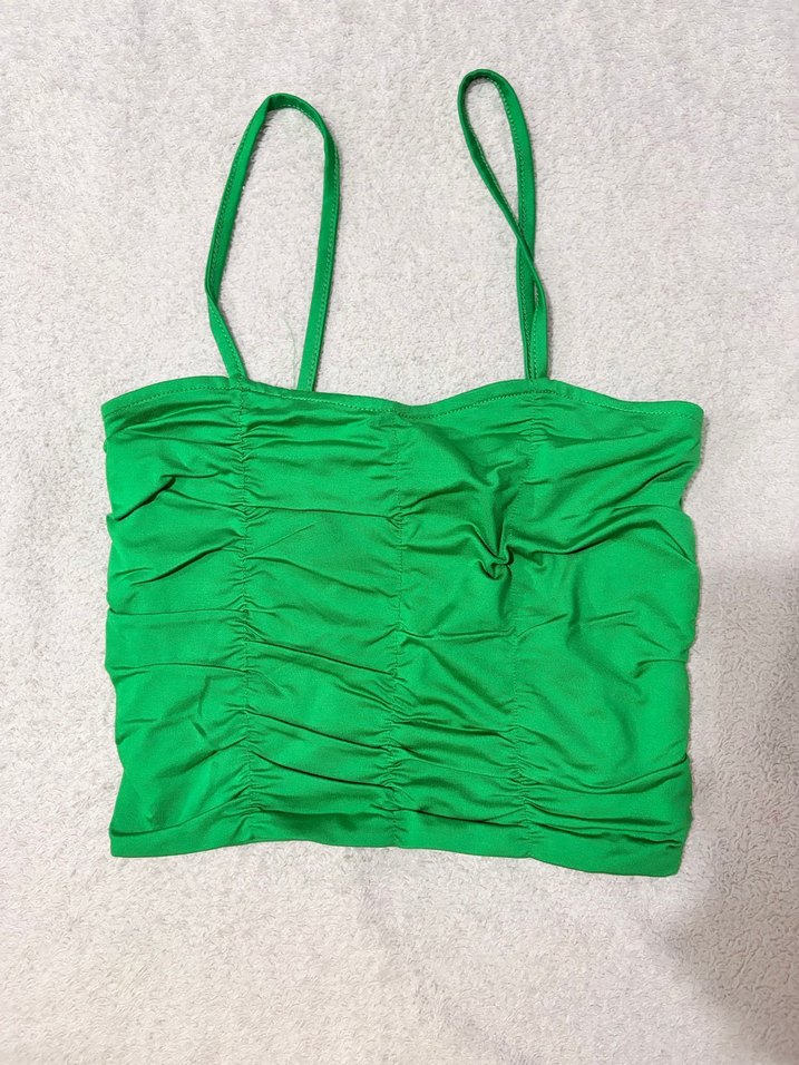 İnce askılı, büzgülü yeşil büstiyer. Dar kesim ve straplez etki sunar, günlük kullanım için uygun.