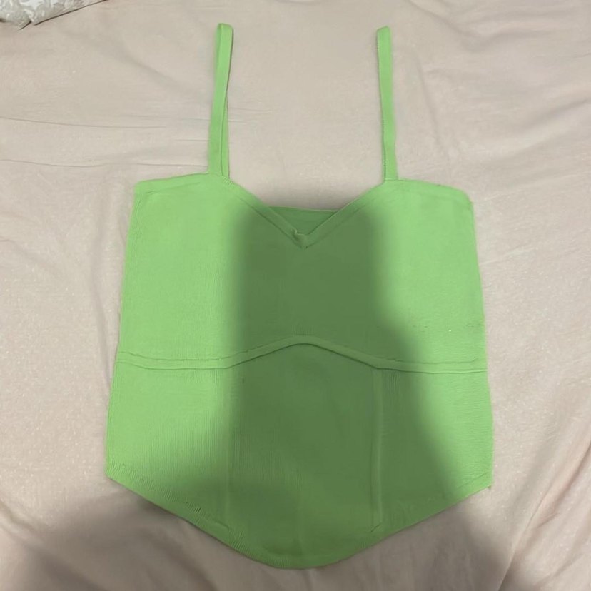 Yeşil renkli, ince askılı ve straplez yakalı, sentetik kumaştan yapılmış, günlük kullanıma uygun, dar kesim crop.