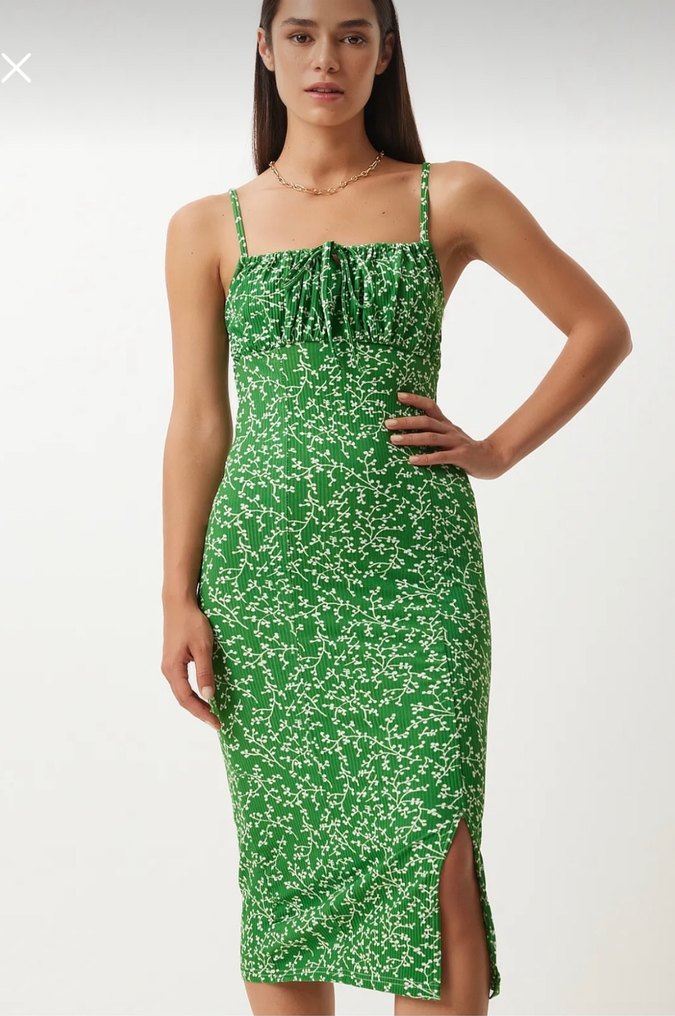 İnce askılı, drapeli yakalı, hafif yeşil batik desenli, yumuşak sentetik kumaştan yapılmış, vücuda oturan midi elbise. S-L mevcut