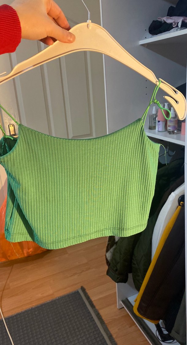 Yeşil renkli, ince askılı ve straplez yakalı, örme sentetik kumaştan yapılmış, normal midi boyda, trend sokak stili için uygun kadın atlet.