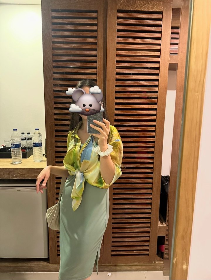 İnce askılı, minimalist tasarımlı, çağla yeşili ve düz desenli, sentetik kumaştan yapılmış, uzun ve vücuda oturan elbise. Diz boyunda, şehir kullanımına uygun. Sağ taraf hafif yırtmaçlı.
