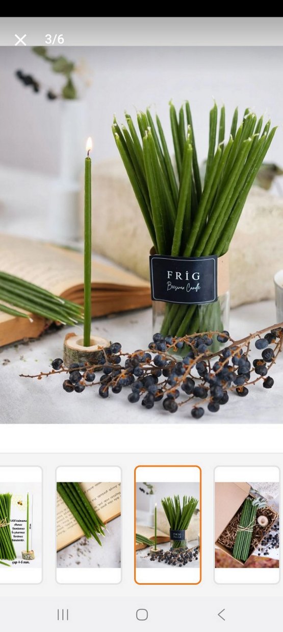 Koyu yeşil ince mum, üzerinde 'FRIG' etiketi bulunur. Doğal bir dokunuş katıyor. ️