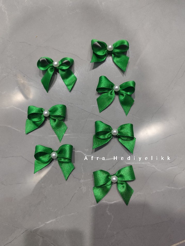 Yeşil renkte inci detaylı fiyonk kurdeleler. 20 adet fiyatıdır