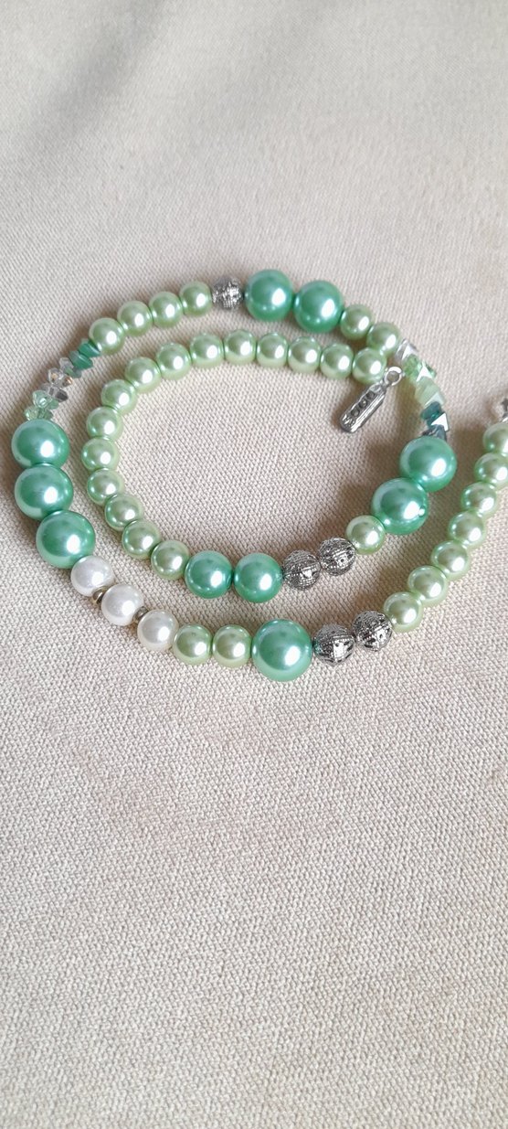 Pastel tonlarda yeşil inci ve çek kristali boncuklardan oluşan kolye, nakışlı detaylarla bohem tarzı yansıtır. 43cm +5cm uzatma , vintage havasında. Gece veya gündüz kıyafetlerinizin tamamlayıcısı. Gardropsumdaki diğer ürünlere bakmadan geçmeyin