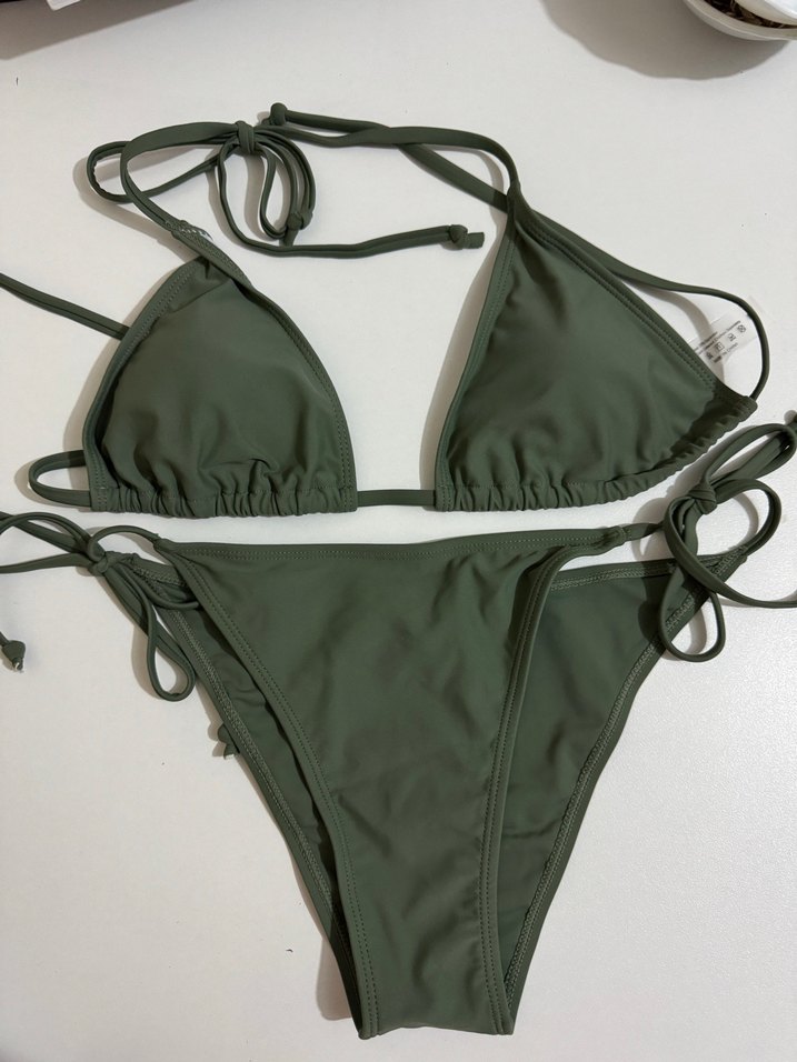 İpli, fitted kesim ve koyu yeşil renkte, desen içermeyen kadın bikini takımı. Plajda ve athleisure tarzda rahatlıkla kullanılabilir, zahmetsiz şıklık sunar.