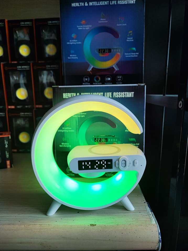 Yeşil renkli Bluetooth hoparlör, canlı ışık efektleri ve dijital ekranla modern bir tasarıma sahiptir. Ses ve ışığı bir arada sunar.