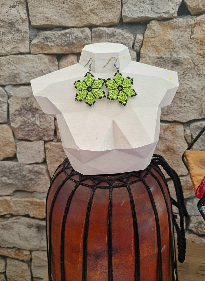 Yeşil işlemeli, boncuk detaylı, günlük kullanıma uygun bohem tarzda renkli küpeler.