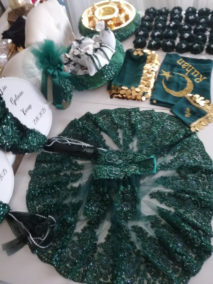 Parlak yeşil işlemeler ve boncuk detaylarla süslenmiş, tekne yaka ve askılı kollu, vücuda oturan uzun kadın abiye elbise. ✨