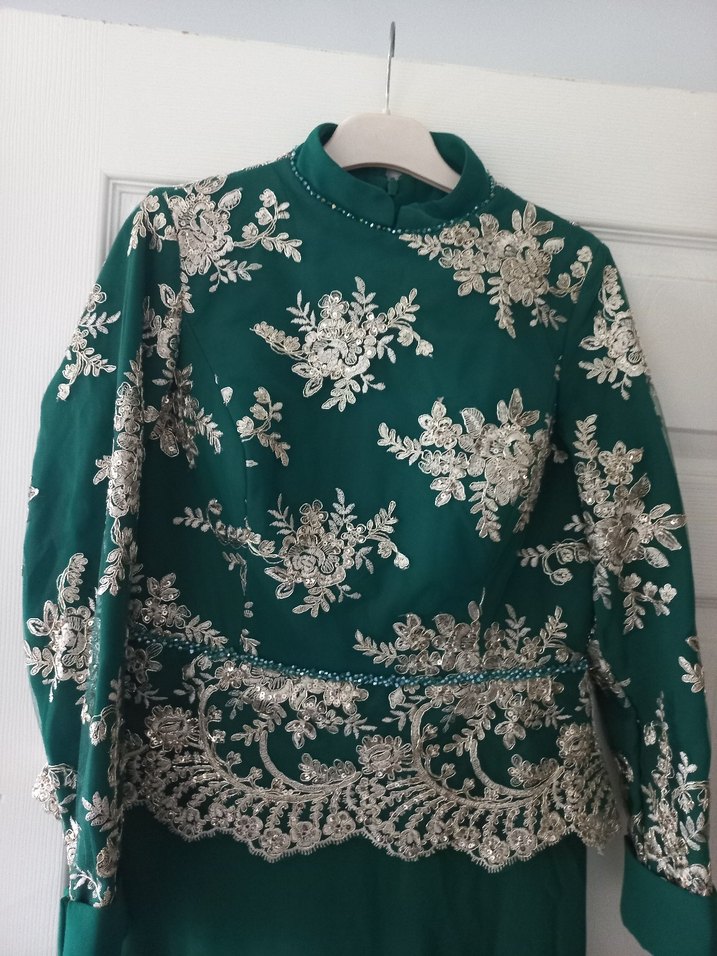 Yeşil, uzun ve dar kesim abiye elbise, yüksek yakalı ve uzun kollu, parlak işlemeli dantel detaylara sahip, düğünler için uygun.