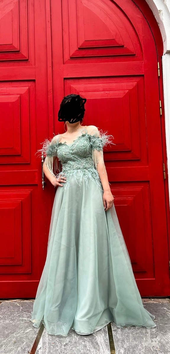 Yeşil renkli, straplez ve işlemeli detaylara sahip uzun abiye elbise. Drapeli ve fitted kesimiyle modern klasik tarzda, düğün için uygundur. 1 kere giyildi.
