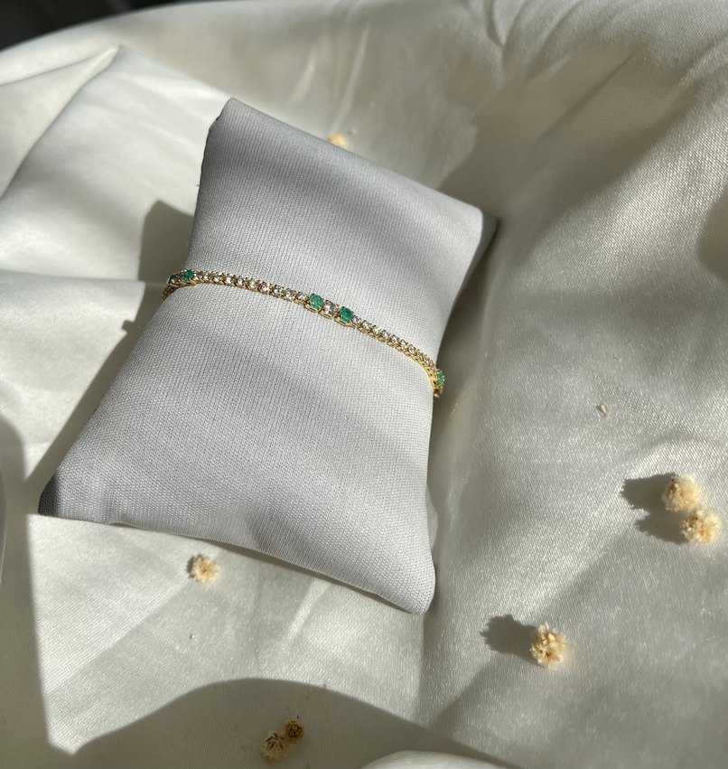 Yeşil taşlar ve işlemeli detaylar içeren ince bileklik, günlük kullanım için minimalist ve çağdaş bir tarz sunar.