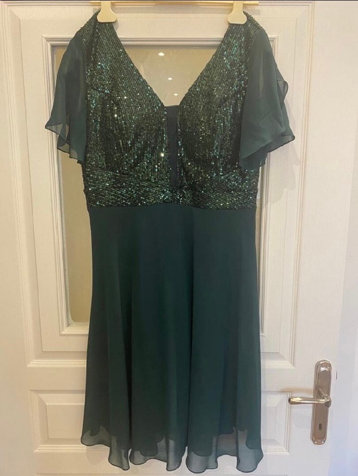 Yeşil renkli, V yakalı ve kısa kollu bu elbise payetli ve işlemeli üst kısmıyla modern klasik tarzı yansıtır, düğünler için uygundur. Ürün 44 bedendir kuru temizlemesi yapılmıştır bel 46 cm boy 117 cm dir