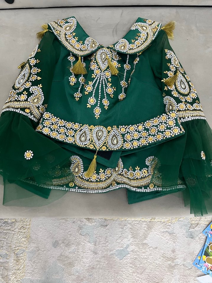Uzun yeşil kına elbisesi yakalı ve uzun kollu, işlemeli ve boncuk detaylıdır. Salaş kesimi ve parlak kumaşıyla düğünler için uygundur.