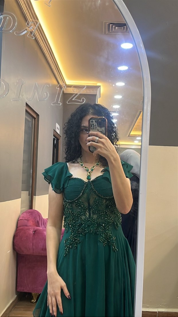 Yeşil, işlemeli ve parlak payet detaylı, straplez ve vücuda oturan midi abiye elbise. Bohem tarzda, kolsuz ve düğünler için uygun.