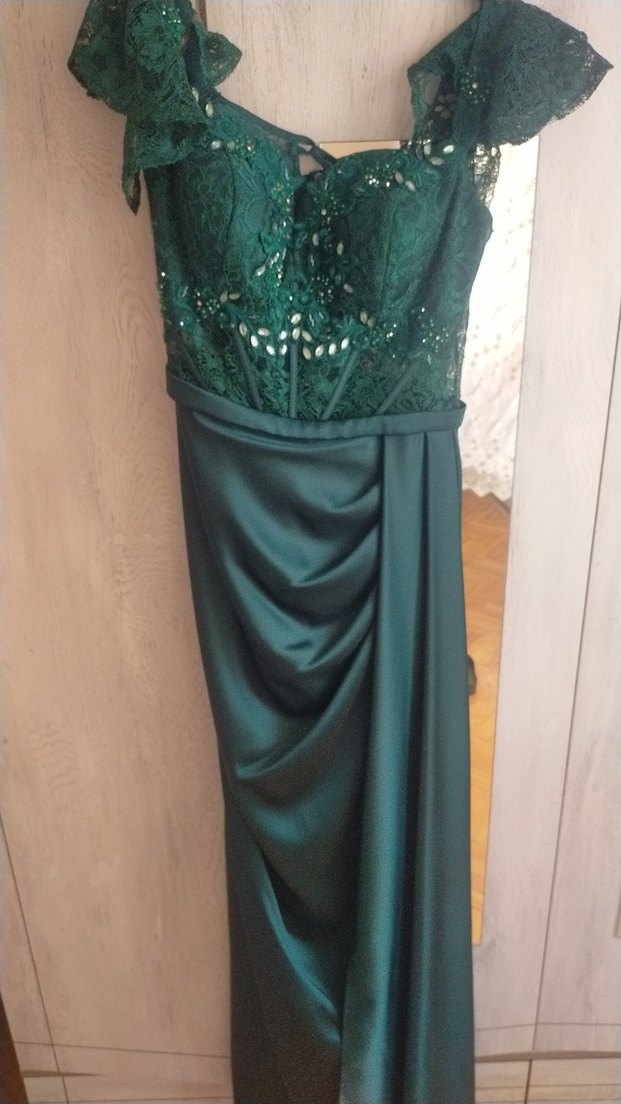 Koyu yeşil, işlemeli ve straplez yaka uzun abiye elbise. Drapeli ve vücuda oturan kesimi ile şık ve modern klasik tarzda, düğünler için uygun. Kollu değil.
