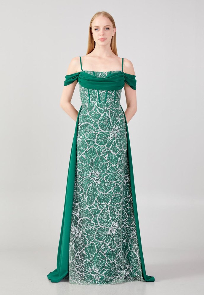 Yeşil İşlemeli Uzun Abiye Elbise