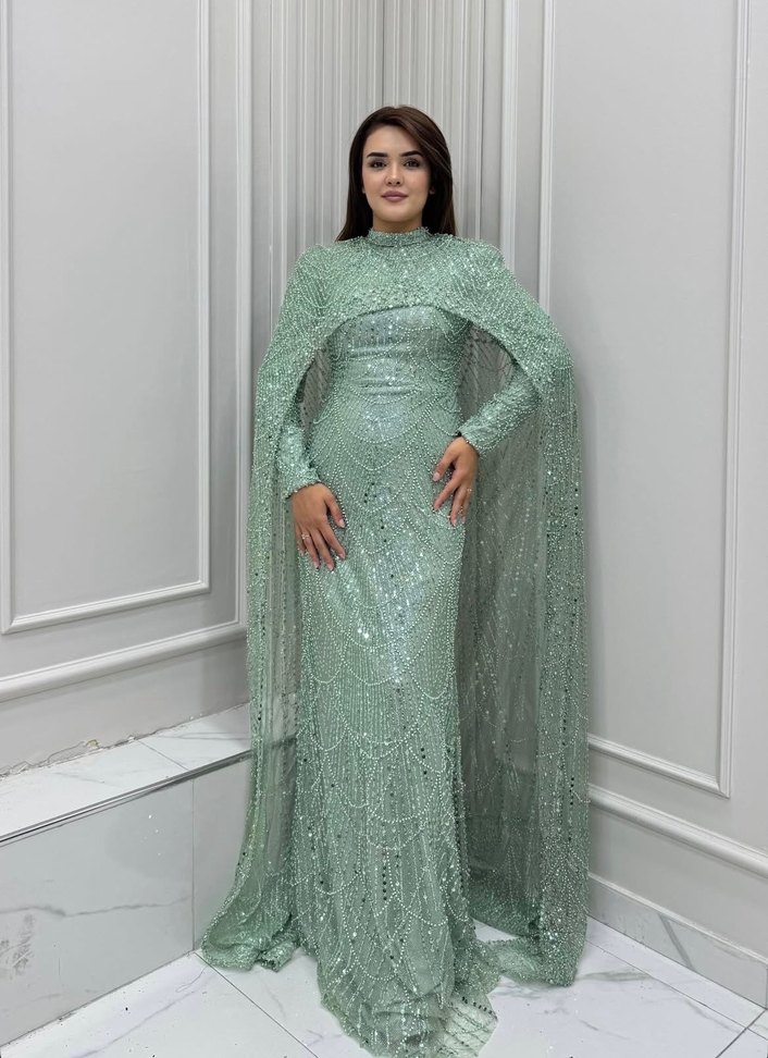 Bu açık yeşil uzun abiye elbise, yüksek yakalı ve uzun kollu, vücuda oturan kesime sahiptir. Detaylı işlemeleri ve drapeli tasarımıyla düğünler için uygundur. Ayrıca şal ile birlikte satılıktır bi defa kullanildi