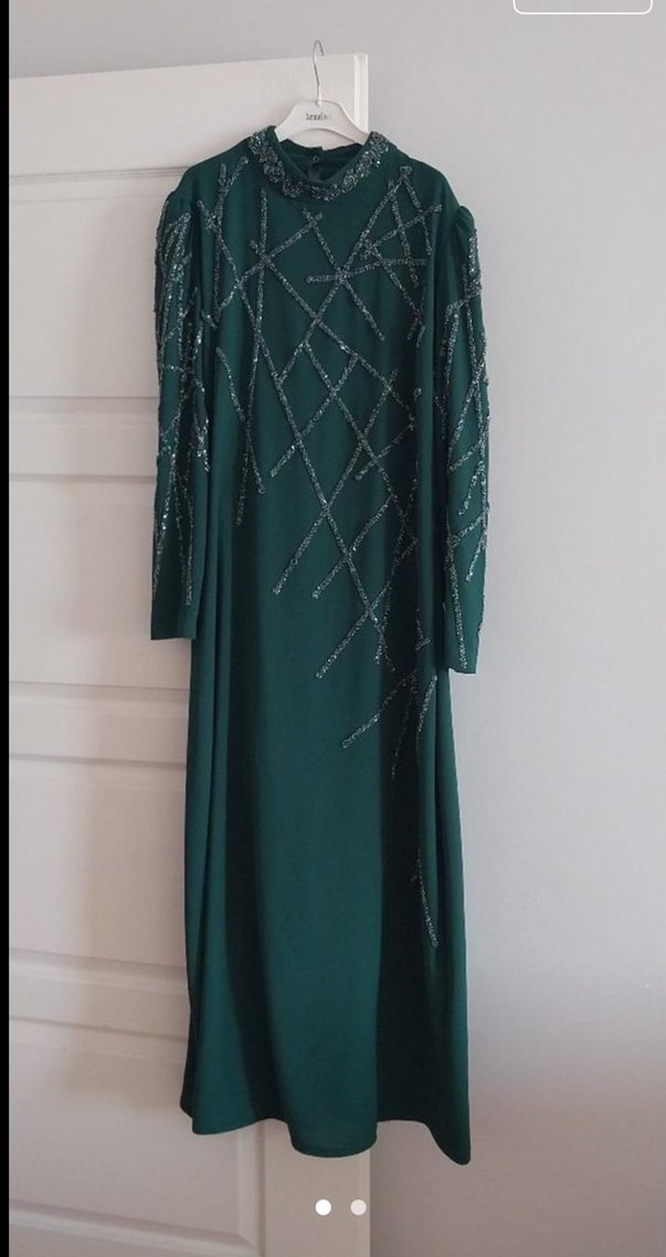 Koyu yeşil uzun abiye elbise, yüksek yakalı ve işlemeli desenlere sahiptir. Drapeli tasarım ve askılı kollu, düzenli kesim, mütevazı ve avangart tarzlar için uygundur. ablamın kınada giyildi bir kez