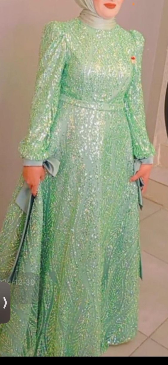Parlak yeşil işlemeli uzun abiye elbise, uzun kollu ve bol kesim, düğünler için uygun drapeli tasarıma sahip.