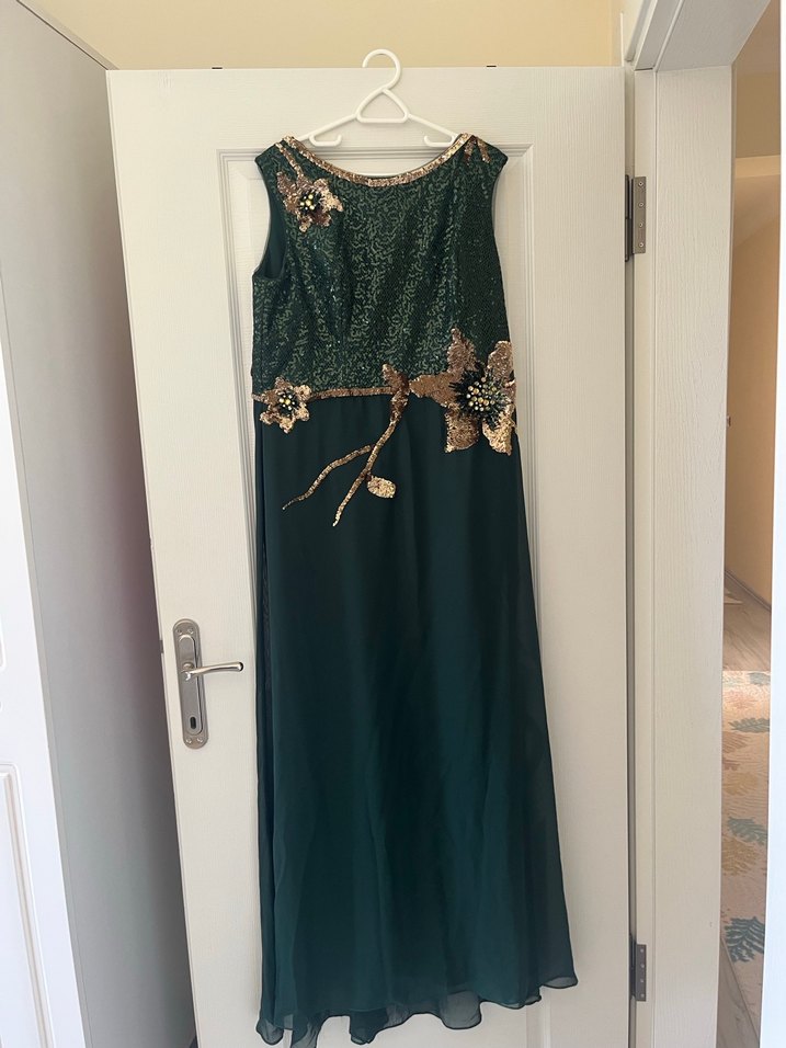 Saten görünümlü yeşil kumaş üzerine parlak işlemeli çiçek detaylarıyla, drapeli uzun abiye elbise.