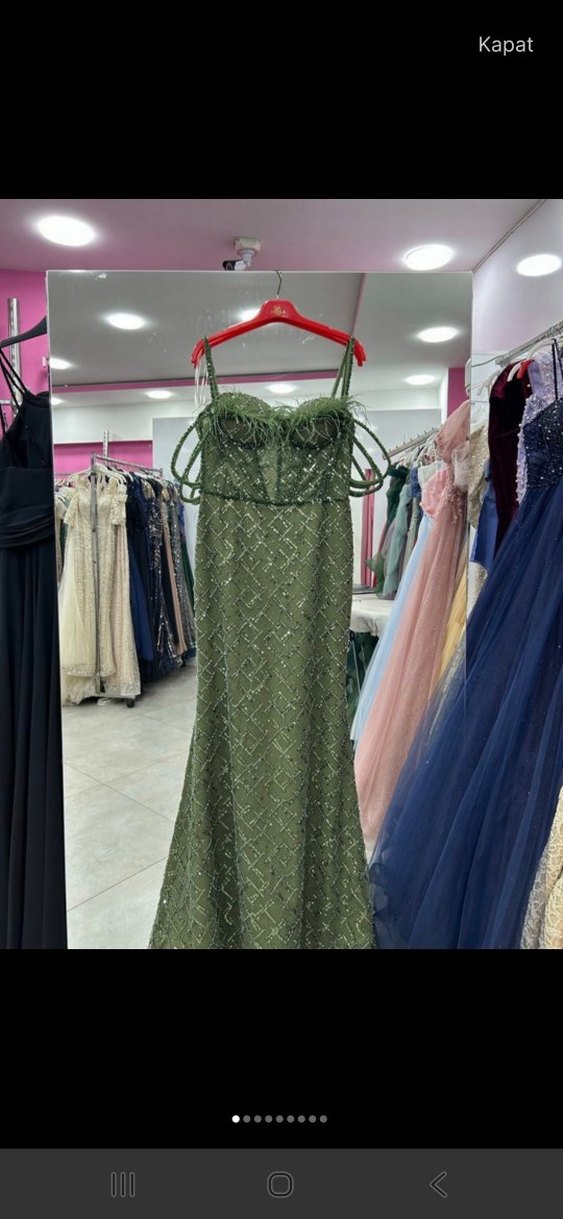 Fitted kesim, askılı ve straplez bu abiye elbise, parlak yeşil kumaş ve detaylı işlemelerle düğünler için uygun.