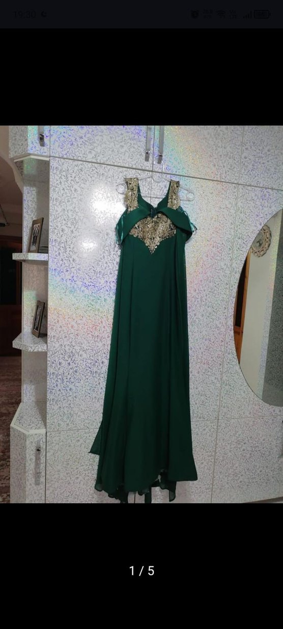 Yeşil işlemeli, askısız, drapeli uzun elbise, bol kesim ve klasik şıklık sunar. Düğün için uygundur. ✨