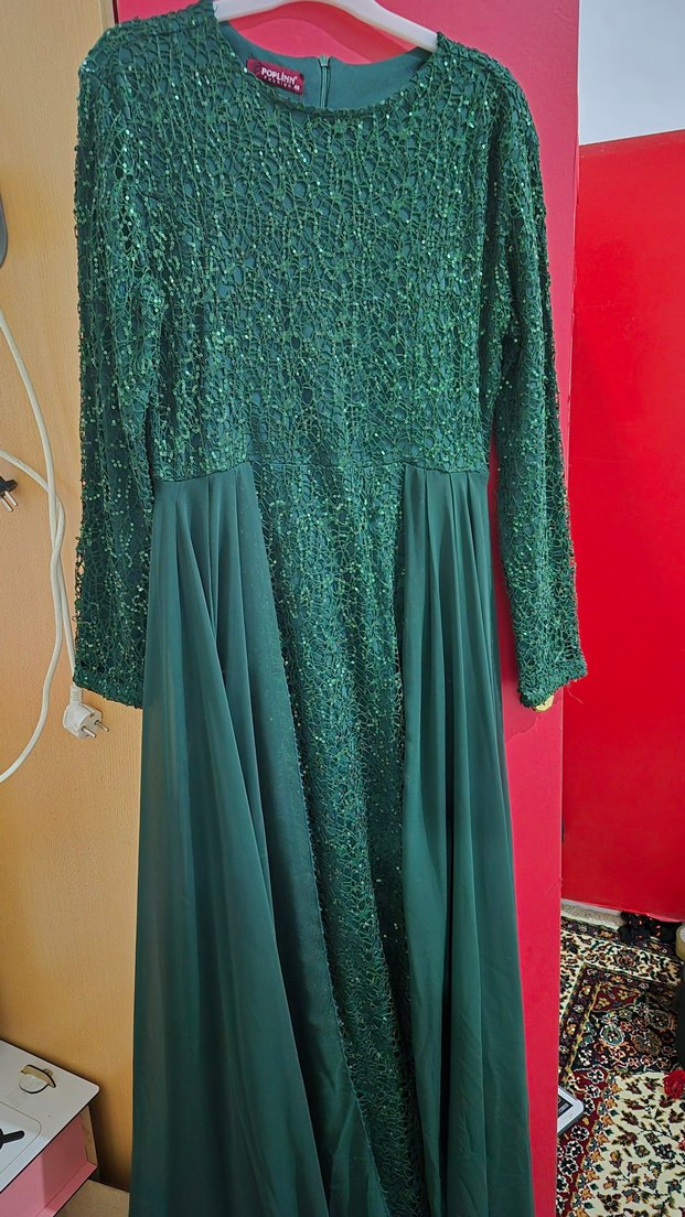 Bu koyu yeşil uzun abiye elbise, işlemeli detaylara ve drapeli kesime sahiptir. Uzun kollu ve yuvarlak yakalıdır, düğünler için uygundur.