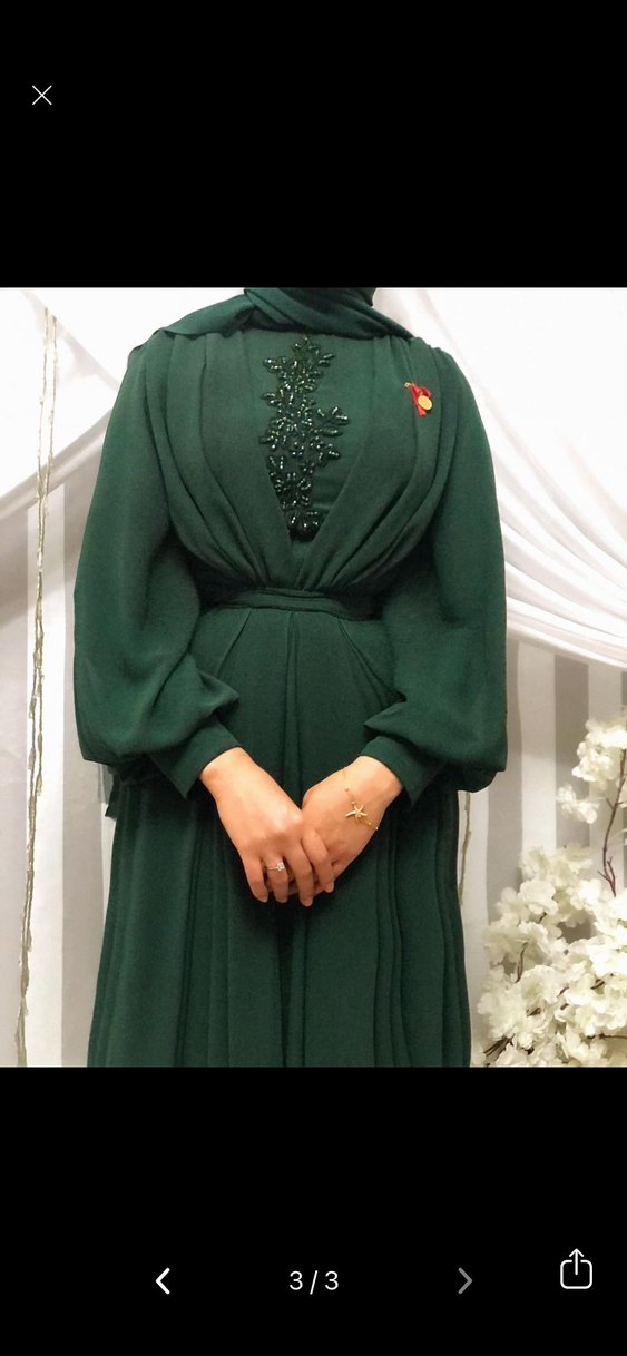 Koyu yeşil renkli, yüksek yakalı ve uzun kollu, drapeli ve bol kesimli uzun abiye elbise. Ön kısmında işlemeli detaylar bulunur, düğün için uygundur.