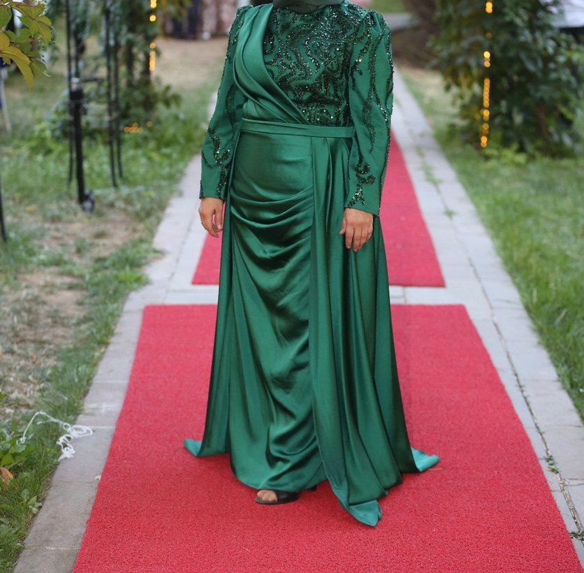 Yeşil İşlemeli Uzun Kollu Abiye Elbise