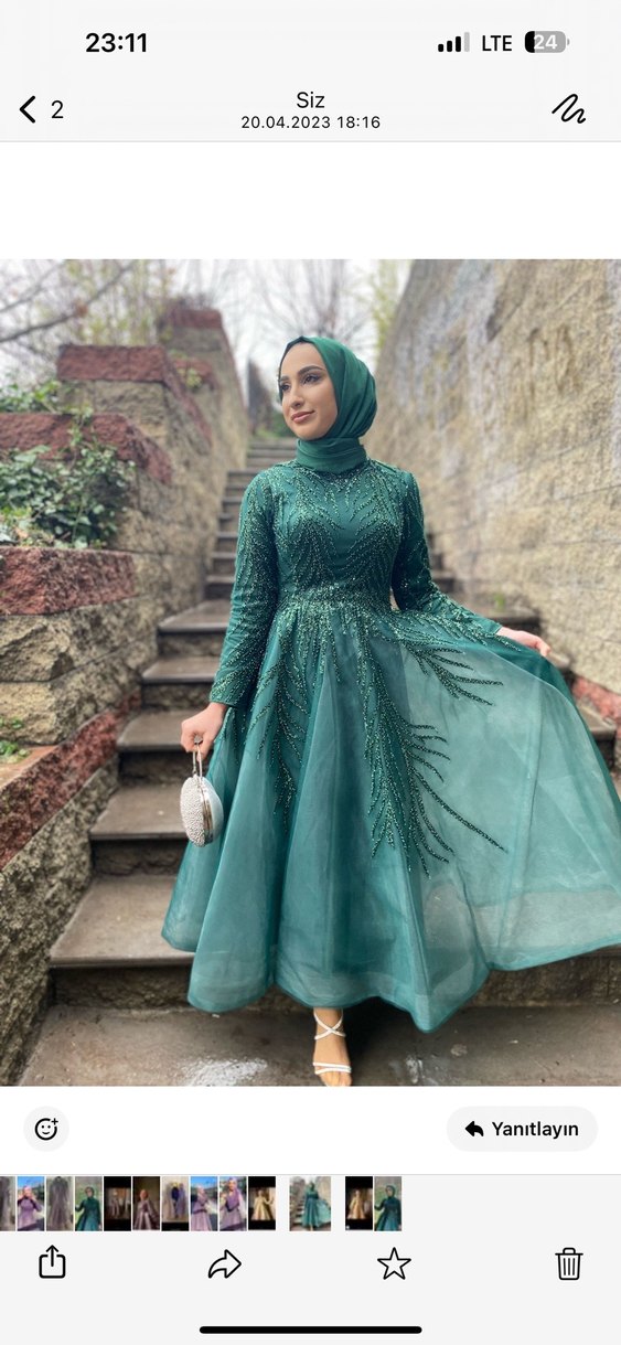 Yeşil İşlemeli Uzun Kollu Abiye Elbise